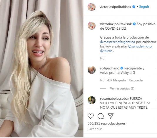 La semana pasada Vicky Xipolitakis había anunciado que se había contagiado de Covid por lo que debería dejar las grabaciones de MasterChef Celebrity Argentina y asilarse en su casa. En un posteo en sus redes sociales la participante estrella del ciclo de cocina se mostró muy angustiada y manifestó su miedo ante la incertidumbre sobre cómo le tocaría atravesar la enfermedad.