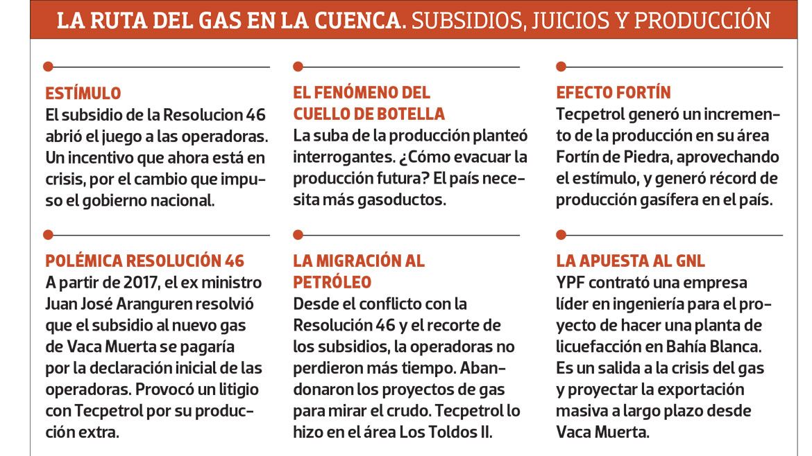 Vaca Muerta tuvo un empuje de la producción con el Plan Gas (sostenía un subsidio escalonado con un pico de 7,5 dólares el millón de BTU en forma descendente hasta los 6 dólares en cuatro años) y las operadoras comenzaron a apostar a esa ventana. Después vino la Resolución 46/2017 con la que el Estado nacional reconoció solo la producción inicial declarada por las operadoras, para abonar ese subsidio, y no la producción extra. La decisión llevó a una a suerte de batalla con el Grupo Techint, que en el brazo petrolero hizo historia en el yacimiento neuquino Fortín de Piedra, donde alcanzó un plateau de 17,5 MMm³/d. Solo por el gas que Tecpetrol sacó de esa área, no se desplomó la producción de gas en el país durante 2018.