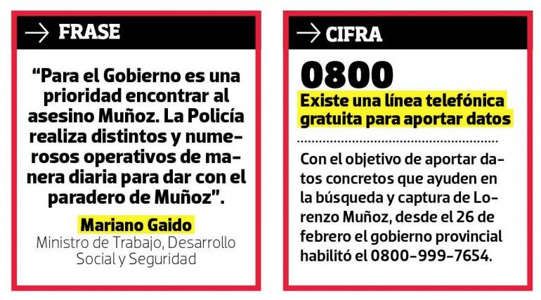 Con el objetivo de aportar datos concretos que ayuden en la búsqueda y captura de Lorenzo Muñoz, desde el 26 de febrero el gobierno provincial habilitó el 0800-999-7654.