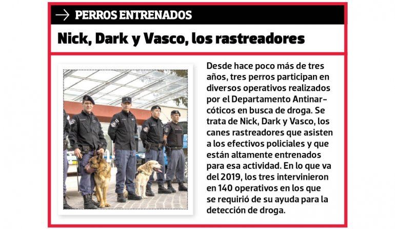 Para realizar los operativos, el Departamento Antinarcóticos también cuenta con tres canes especialmente entrenados y capacitados para rastrear las sustancias (ver recuadro) y con un escáner. El mismo es empleado por efectivos que han sido capacitados para su utilización y así poder detectar, por ejemplo, cuando se llevan panes de droga en el interior de vehículos, bolsos o en colectivos. Con la utilización de este último recurso, se hicieron 120 diligencias en el año y se espera la incorporación de otro escáner para poder ser enviado al interior.