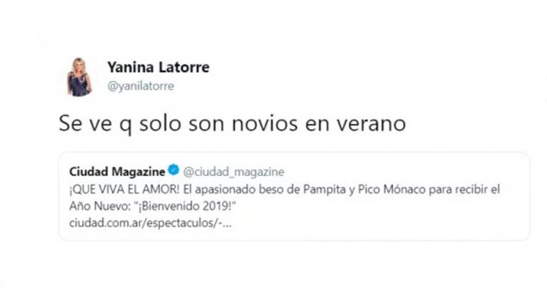 Minutos después de que Pampita sorprendiera a la comunidad tuitera anunciando su separación de Pico Mónaco, Yanina Latorre aprovechó para sacar chapa y jactarse del acierto de su predicción sobre el destino de la pareja que para ella fue como una crónica de una muerte anunciada.