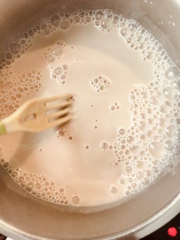 Calentas la medida de la taza de leche en un cacerola a fuego mediano, solo unos minutos , vas revolviendo para que empiece a airear y se haga espuma. No dejar hervir.