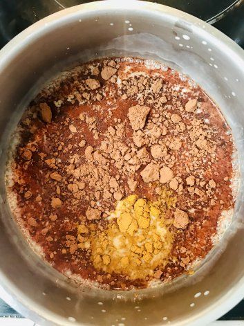 La leche la pasas a una minipimer o batidora de vaso (licuadora allá) y le agregas el cacao y la cúrcuma y batís hasta que se mezcle todo muy bien y te quede un batido de color café con leche un poco amarillento por la cúrcuma.