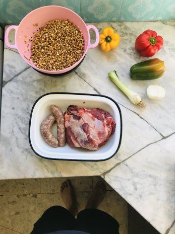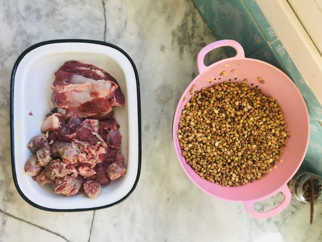 Utilizo los cortes de carne que tengo freezados, en esta oportunidad Aguja y chorizo y los cocino lento. Remojo 24 horas las lentejas, cambiándoles el agua dos veces como mucho.