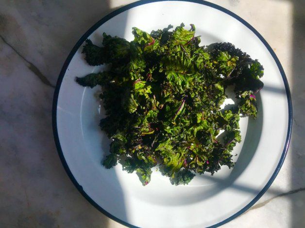 Hace crunch, crash, ruidito a que se quiebra, se rompe, cae la sal, el ajo, la ralladura de limón, la boca se te llena de un sabor rico, largo, que va mutando. Tiene aire, laminitas que se deshacen, no es una papa frita industrial, una tostada...es kale, de la familia de las coles, primo del coliflor, brócoli, repollitos de Bruselas. Tiene una cantidad nada despreciable de vitaminas Ay C, calcio y otros nutrientes.