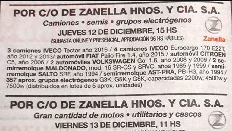 En un diario de San Luis la empresa publicó un aviso donde figuran una serie de bienes de la empresa: 41 motos, 1330 cascos, 7 camiones IVECO, vehículos (Fiat Palio y Citroën C5), dos semirremolques, grupos electrógenos, scooters y utilitarios.