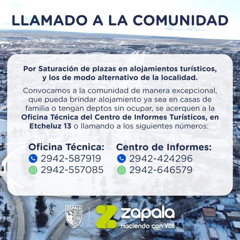 "Estamos buscando un lugar para ubicar gente que esté en condiciones, que tenga colchones, sanitarios y calefacción. Por suerte estamos teniendo buena respuesta. Teníamos una lista de seis viviendas alternativas y se fueron sumando otras siete alternativas más. Igual hay que tener cuidado porque son casas de familia y no tienen disponibilidad todo el día. Hay gente que ofrece un día y otro día no. No es que es tenemos disponibilidad siempre, pero, al menos, contamos con teléfonos para armar listados ante un alerta por nevadas", señaló Carolina Trabe, coordinadora general de Turismo de Zapala.